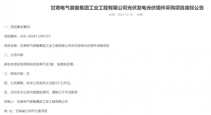 近日,甘肅電氣裝備集團(tuán)工業(yè)工程有限公司光伏發(fā)電光伏組件采購項目廢標(biāo)公告發(fā)布,公告顯示,因參加本項目有效投標(biāo)供應(yīng)商不足3家,該光伏組件采購項目按廢標(biāo)處理。
