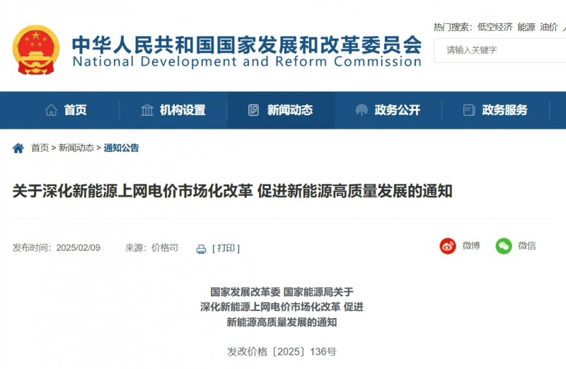 為貫徹落實黨的二十屆三中全會關于推進能源領域價格改革的決策部署,充分發(fā)揮市場在資源配置中的決定性作用,推動新能源行業(yè)高質量發(fā)展,促進能源綠色低碳轉型,近日國家發(fā)展改革委、國家能源局聯(lián)合印發(fā)《關于深化新能源上網(wǎng)電價市場化改革促進新能源高質量發(fā)展的通知》(發(fā)改價格〔2025〕136號)。就此,記者采訪了國家發(fā)展改革委、國家能源局有關負責同志。