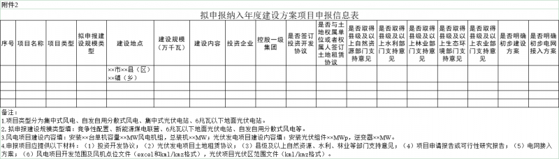 (二)擬申報(bào)納入年度建設(shè)方案項(xiàng)目:填報(bào)項(xiàng)目申報(bào)信息包括項(xiàng)目名稱、建設(shè)地點(diǎn)、建設(shè)內(nèi)容與規(guī)模、投資主體、投資開發(fā)協(xié)議簽訂情況、用地落實(shí)情況、取得相關(guān)部門支持性文件情況、建設(shè)方案編制情況、初步電網(wǎng)接入方案、擬通過何種方式取得建設(shè)規(guī)模等(附件2)。