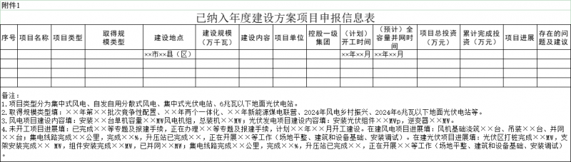 光伏發(fā)電項(xiàng)目(不含分布式光伏發(fā)電項(xiàng)目)和風(fēng)電項(xiàng)目,分為已納入年度建設(shè)方案項(xiàng)目、擬申報(bào)納入年度建設(shè)方案項(xiàng)目、謀劃項(xiàng)目三種類型。