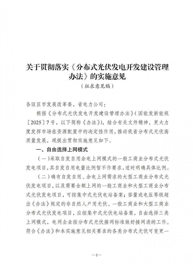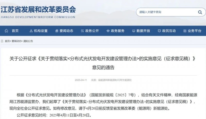 根據(jù)《分布式光伏發(fā)電開發(fā)建設(shè)管理辦法》(國能發(fā)新能規(guī)〔2025〕7號(hào)),結(jié)合有關(guān)文件精神,經(jīng)商國家能源局江蘇能源監(jiān)管辦,我們起草了《關(guān)于貫徹落實(shí)<分布式光伏發(fā)電開發(fā)建設(shè)管理辦法>的實(shí)施意見(征求意見稿)》,現(xiàn)向全社會(huì)公開征求意見。如有修改意見,請(qǐng)于4月20日前反饋至省發(fā)展改革委(能源局)新能源處。