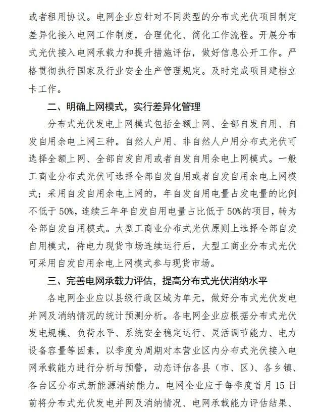據(jù)征求意見稿內(nèi)容顯示,文件明確上網(wǎng)模式,實行差異化管理。分布式光伏發(fā)電上網(wǎng)模式包括全額上網(wǎng)、全部自發(fā)自用、自發(fā)自用余電上網(wǎng)三種。自然人戶用、非自然人戶用分布式光伏可選擇全額上網(wǎng)、全部自發(fā)自用或者自發(fā)自用余電上網(wǎng)模式。其中,一般工商業(yè)分布式光伏可選擇全部自發(fā)自用或者自發(fā)自用余電上網(wǎng)模式;采用自發(fā)自用余電上網(wǎng)的,年自發(fā)自用電量占發(fā)電量的比例不低于50%,連續(xù)三年年自發(fā)自用電量占比低于50%的項目,轉(zhuǎn)為全部自發(fā)自用模式。