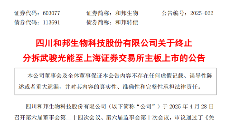 公告中提到,自籌劃此次分拆上市事宜起,和邦生物便積極推進(jìn)各項工作,包括組織中介機構(gòu)開展盡職調(diào)查等,并嚴(yán)格依照相關(guān)法律法規(guī)及規(guī)范性文件要求,履行了必要的決策程序與信息披露義務(wù)。然而,鑒于當(dāng)前市場環(huán)境相較于籌劃分拆上市時已出現(xiàn)重大變化,經(jīng)公司與相關(guān)方充分溝通并審慎評估后,為切實保障公司及廣大投資者的利益,和邦生物決定終止武駿光能至上交所主板的分拆上市工作,并撤回相關(guān)上市輔導(dǎo)材料。