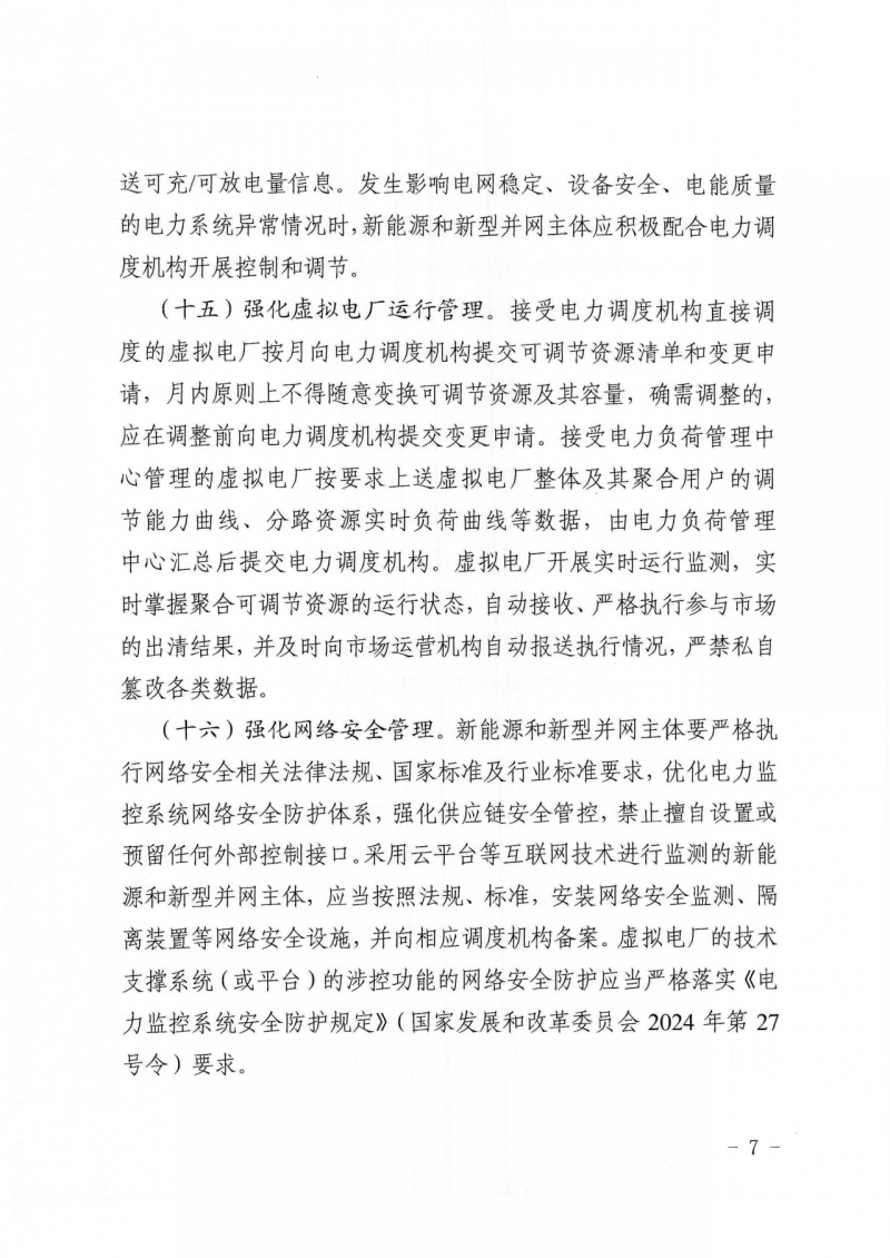 在并網(wǎng)運(yùn)行管理中,文件強(qiáng)調(diào),電化學(xué)儲(chǔ)能新能源和新型并網(wǎng)主體還應(yīng)上送可充/可放電量信息。發(fā)生影響電網(wǎng)穩(wěn)定、設(shè)備安全、電能質(zhì)量的電力系統(tǒng)異常情況時(shí),應(yīng)積極配合電力調(diào)度機(jī)構(gòu)開(kāi)展控制和調(diào)節(jié)。虛擬電廠開(kāi)展實(shí)時(shí)運(yùn)行監(jiān)測(cè),實(shí)施掌握聚合可調(diào)節(jié)資源的運(yùn)行狀態(tài),自動(dòng)接收、嚴(yán)格執(zhí)行參與市場(chǎng)的出清結(jié)果,并及時(shí)向市場(chǎng)運(yùn)營(yíng)機(jī)構(gòu)自動(dòng)報(bào)送執(zhí)行情況,嚴(yán)謹(jǐn)私自篡改各類(lèi)數(shù)據(jù)。
