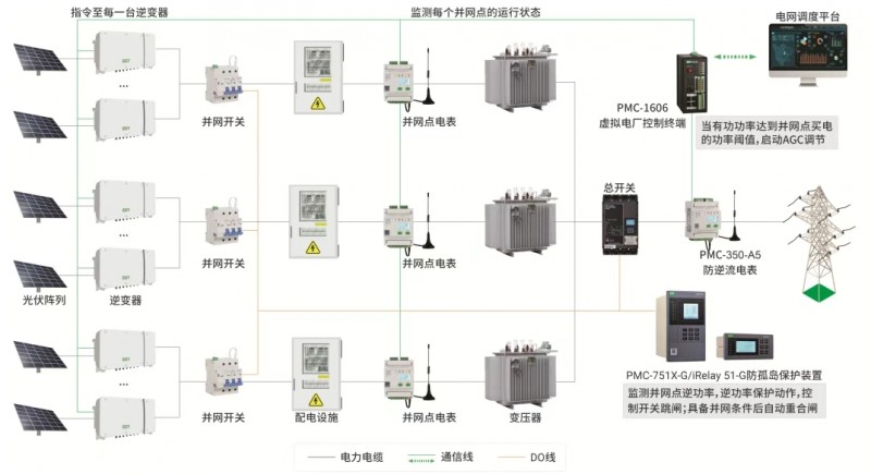 CET-7320-B控制終端與PMC-350-A5防逆流電表配合,采集光伏與電網(wǎng)公共連接點的實時功率,產(chǎn)品內(nèi)置的AGC智能算法可以實時跟蹤負荷變化,動態(tài)調(diào)節(jié)逆變器的有功功率輸出,既達到防逆流的目的,又兼顧了發(fā)電效益,使得光伏在不切斷的情況下,應(yīng)發(fā)盡發(fā)。
