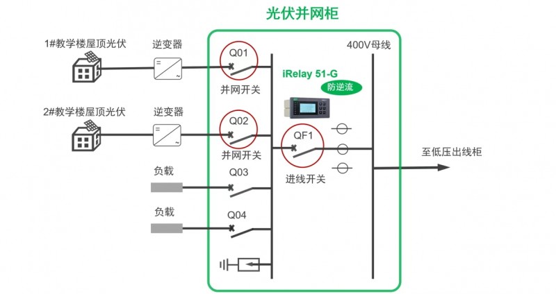 在10kV以下的光伏發(fā)電系統(tǒng)中,推薦在光伏并網(wǎng)柜安裝iRelay 51-G并投入逆功率保護功能。當(dāng)并網(wǎng)開關(guān)出現(xiàn)逆流,iRelay 51-G監(jiān)測到逆功率后觸發(fā)保護動作,選擇跳開Q01并網(wǎng)開關(guān),降低發(fā)電功率,保證全部發(fā)電自發(fā)自用;如果iRelay 51-G再次監(jiān)測到逆功率,便會觸發(fā)保護動作跳開Q02并網(wǎng)開關(guān),避免發(fā)生電網(wǎng)逆流。