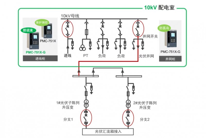 在10kV及以上光伏發(fā)電系統(tǒng)中,推薦在進線柜安裝PMC-751X-G并投入逆功率保護功能,當(dāng)進線柜出現(xiàn)逆流,PMC-751X-G監(jiān)測到逆功率后觸發(fā)保護動作,跳開分支1或分支2斷路器,降低光伏發(fā)電功率,保證全部發(fā)電自發(fā)自用;若PMC-751X-G再次監(jiān)測到逆功率,便會跳開光伏并網(wǎng)開關(guān),避免發(fā)生電網(wǎng)逆流。