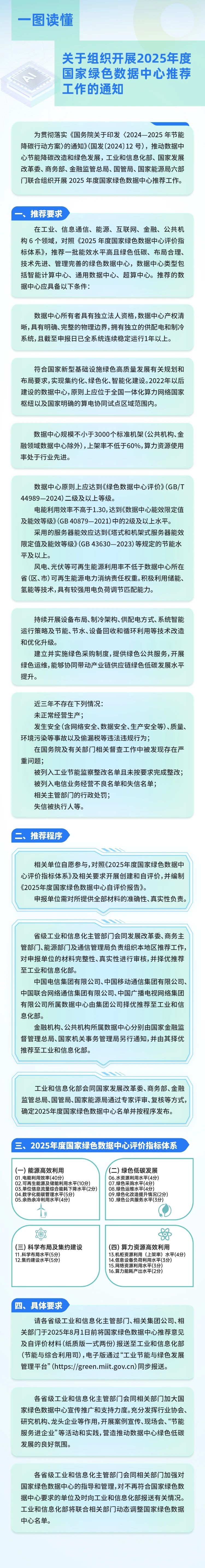 (一)請各省級工業(yè)和信息化主管部門、相關(guān)集團(tuán)公司、相關(guān)部門于2025年8月1日前將國家綠色數(shù)據(jù)中心推薦意見及自評價材料(紙質(zhì)版一式兩份)報送至工業(yè)和信息化部(節(jié)能與綜合利用司),電子版通過“工業(yè)節(jié)能與綠色發(fā)展管理平臺”(https://green.miit.gov.cn)同步報送。