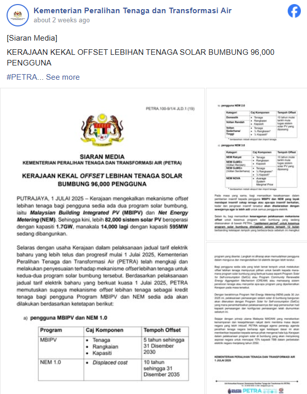 PETRA還聲明,抵扣期已過的現(xiàn)有用戶,可轉(zhuǎn)至其他屋頂光伏計劃,如太陽能自用計劃(SelCo)、社區(qū)可再生能源聚合機制 (CREAM),安裝儲能系統(tǒng),或參與未來的政府計劃。
