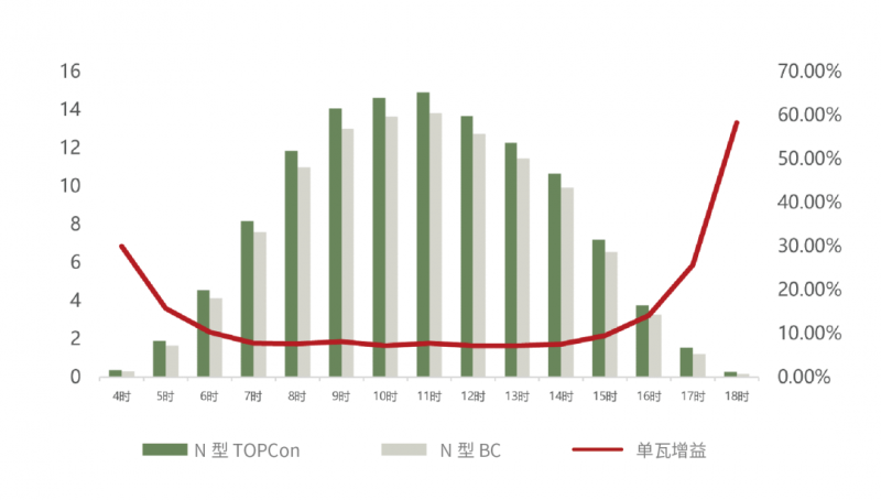 2025年6月2日至30日期間,對(duì)兩類(lèi)組件性能進(jìn)行了全面測(cè)試。測(cè)試數(shù)據(jù)顯示,TOPCon組件29天單瓦發(fā)電量達(dá)119.61 kWh/kW,而N型BC組件為110.47 kWh/kW。TOPCon組件平均每瓦長(zhǎng)期發(fā)電增益達(dá)8.27%。深入分析日變化規(guī)律發(fā)現(xiàn): 在日輻照度較低的時(shí)候(輻照度小于400W/㎡),TOPCon組件的發(fā)電優(yōu)勢(shì)尤為突出,單瓦增益高達(dá)10.79%,充分印證了其在極端弱光條件下的卓越性能。