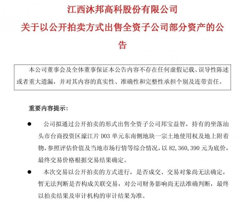 就在消息發(fā)布的兩天前,這家跨界光伏的玩具大佬,已經(jīng)釋放出“賣身自救”的明確信號:公司擬通過公開拍賣方式,出售全資子公司邦寶益智名下的一宗土地及地上建筑。