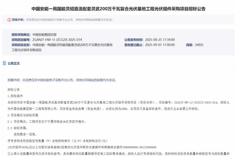 根據(jù)招標(biāo)公告,本次集采的光伏組件型號為585Wp及以上雙面雙玻單晶硅N型高效光伏組件,配防水接插件和跨接線含插件200MW。