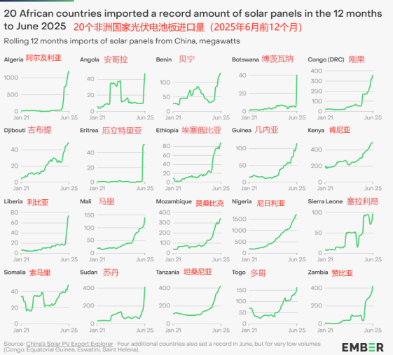 近日據(jù)全球能源智庫(kù)Ember報(bào)道,截至2025年6月的12個(gè)月內(nèi),非洲太陽能電池板進(jìn)口量創(chuàng)下新高,達(dá)到15,032MW,比前12個(gè)月的進(jìn)口量9,379MW增長(zhǎng)了60%。