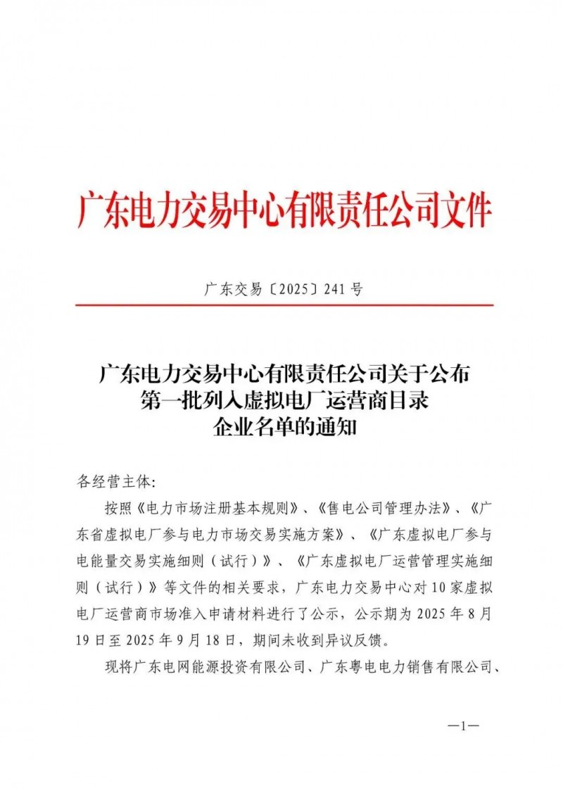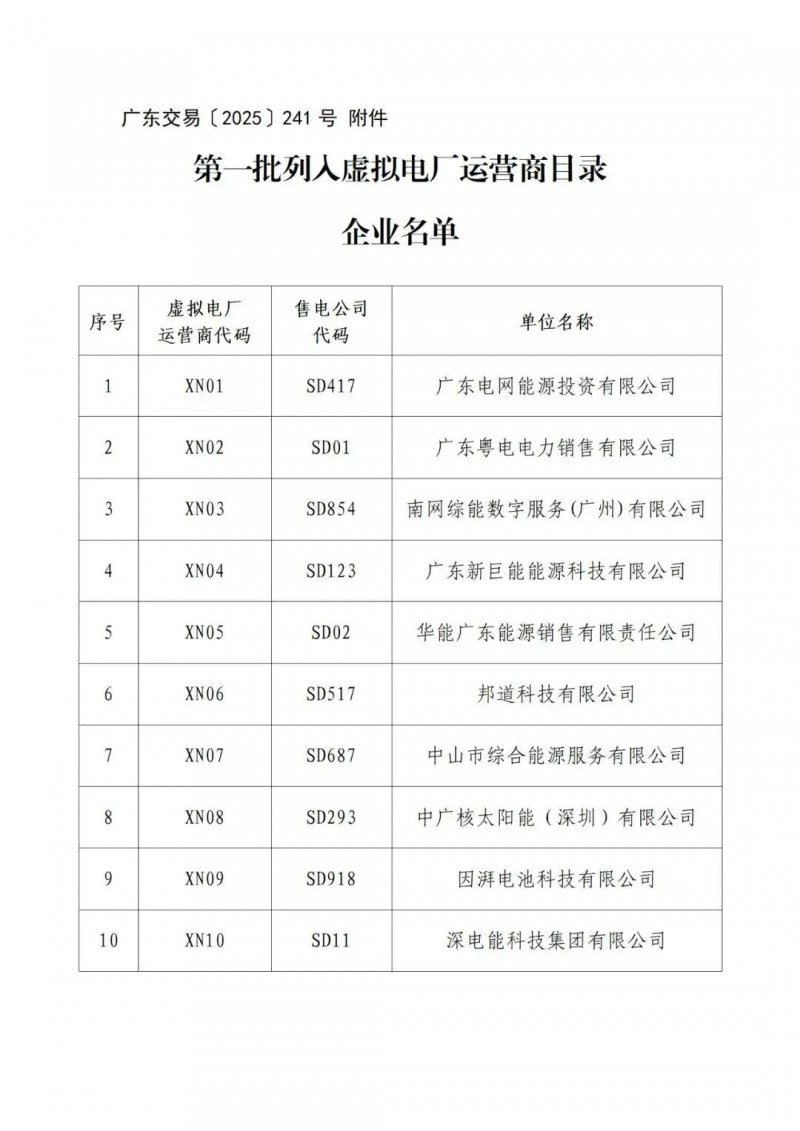 通知明確,上述10家經(jīng)營主體在廣東電力市場的注冊登記自動生效,名單詳情可查閱附件《第一批列入虛擬電廠運(yùn)營商目錄企業(yè)名單》。