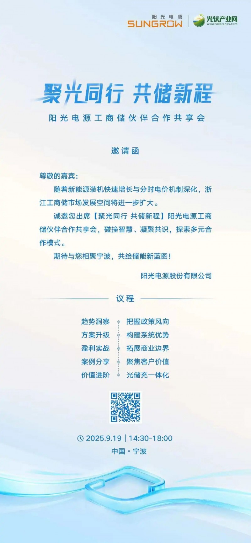 在“雙碳”目標引領下,浙江省作為全國工商業(yè)儲能發(fā)展的排頭兵,正以強勁的政策支持和活躍的市場生態(tài)推動儲能產(chǎn)業(yè)高速發(fā)展。乘此東風,9月19日,陽光電源將于中國·寧波舉辦“工商儲伙伴合作共享會”,聚焦政策解讀、市場機遇、技術方案與合作模式,目前報名通道已全面開啟,誠邀各位行業(yè)伙伴共拓儲能新藍海!