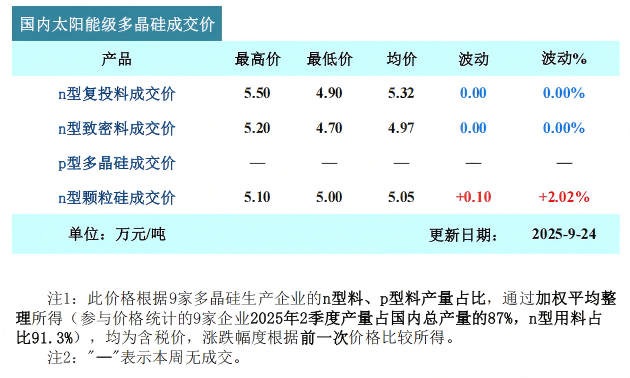 硅料方面:根據(jù)硅業(yè)分會(huì)9月24日公布的數(shù)據(jù)顯示,硅料價(jià)格已經(jīng)突破5萬元/噸。其中,n型復(fù)投料成交均價(jià)已達(dá)到5.32萬元/噸,n型顆粒硅成交均價(jià)達(dá)到5.05萬元/噸。