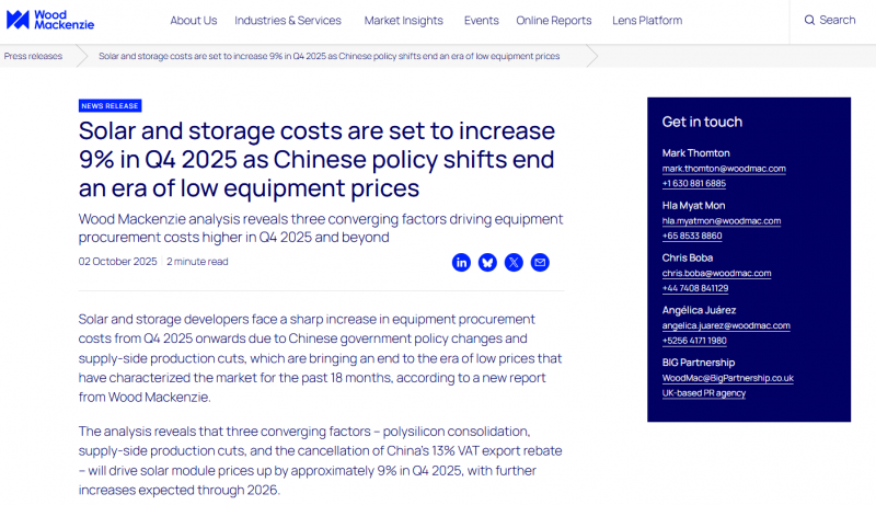 此外,自2025年第四季度起,中國預(yù)計(jì)將取消對(duì)太陽能電池組件和儲(chǔ)能出口的13%增值稅退稅,這將是第三個(gè)決定性因素。伍德麥肯茲解釋說,由于中國供應(yīng)了全球超過80%的太陽能電池組件和90%的儲(chǔ)能用磷酸鐵鋰電池組,退稅的取消將推高全球基準(zhǔn)價(jià)格。