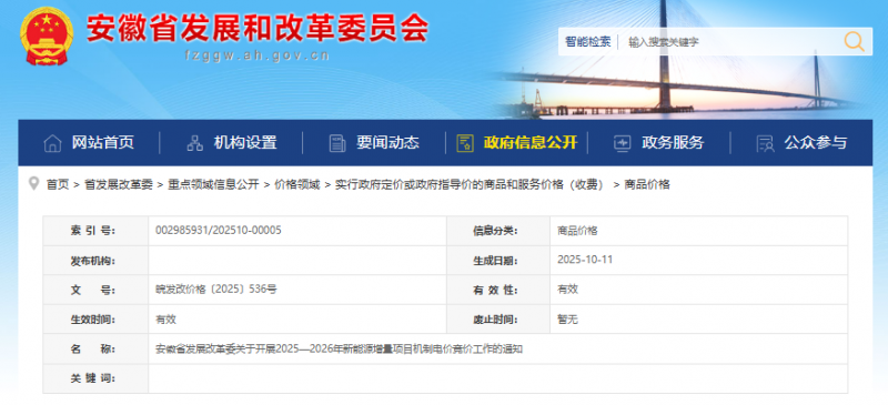 根據(jù)《安徽省發(fā)展改革委安徽省能源局關于印發(fā)安徽省深化新能源上網(wǎng)電價市場化改革促進新能源高質量發(fā)展實施方案的通知》(皖發(fā)改價格〔2025〕505號)要求,為做好2025—2026年新能源增量項目機制電價競價工作,現(xiàn)將有關事項通知如下: