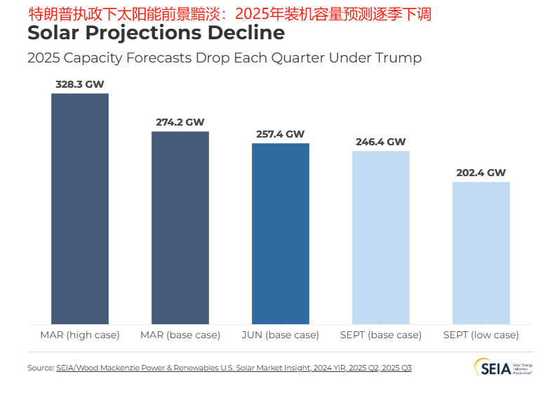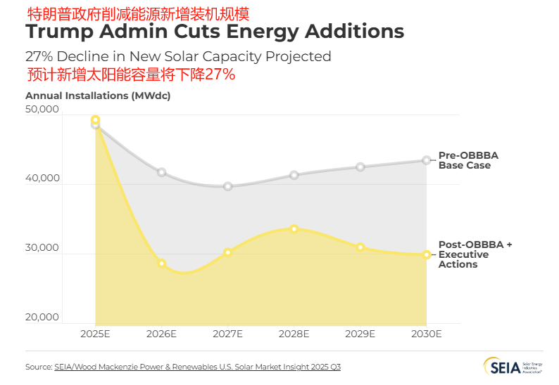 美國太陽能行業(yè)協(xié)會和伍德麥肯茲的預(yù)測顯示,特朗普政府的政策可能導(dǎo)致2026年至2030年間新增太陽能裝機容量下降27%。