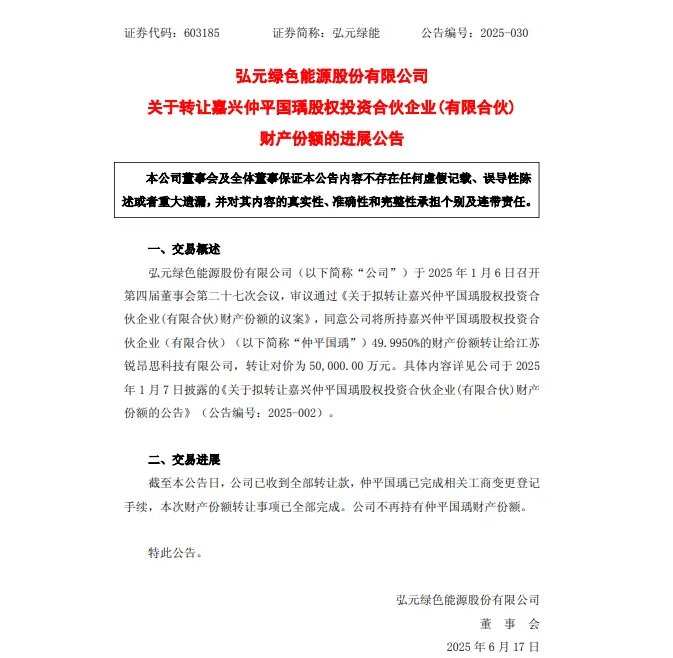 翻開弘元綠能近期公告,一條關(guān)鍵信息映入眼簾:公司已正式完成對嘉興仲平國瑀49.995%股權(quán)的轉(zhuǎn)讓,徹底退出戈恩斯能源的投資鏈條。