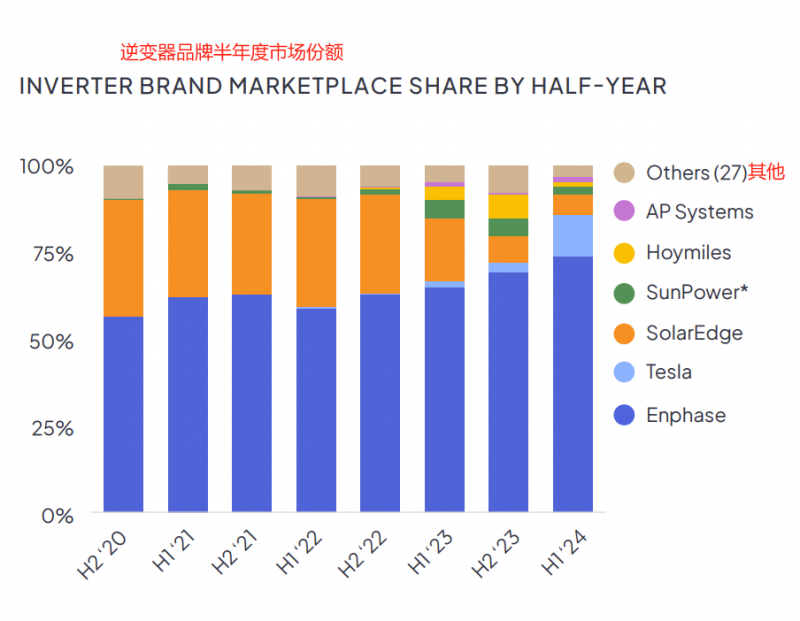 當(dāng)然,也不要忽視本土逆變器巨頭的實力。Enphase、SolarEdge等本地品牌憑借專利、渠道和服務(wù)優(yōu)勢牢牢占據(jù)市場。其占有率多夸張,從下圖中可見一斑。