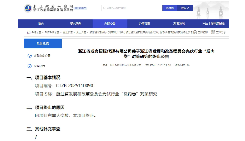 2025年11月13日,浙江省發(fā)改委發(fā)布公告,擬通過競爭性磋商研究光伏“反內(nèi)卷”對策,重點在于壓減產(chǎn)能,預算金額30萬元。浙江發(fā)改委:啟動光伏行業(yè)“反內(nèi)卷”對策研究招標!