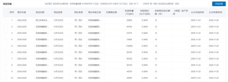 統(tǒng)一項目機制電價為0.384元/度,入圍項目8110個,集中式光伏僅2個,機制電量1754765398度。