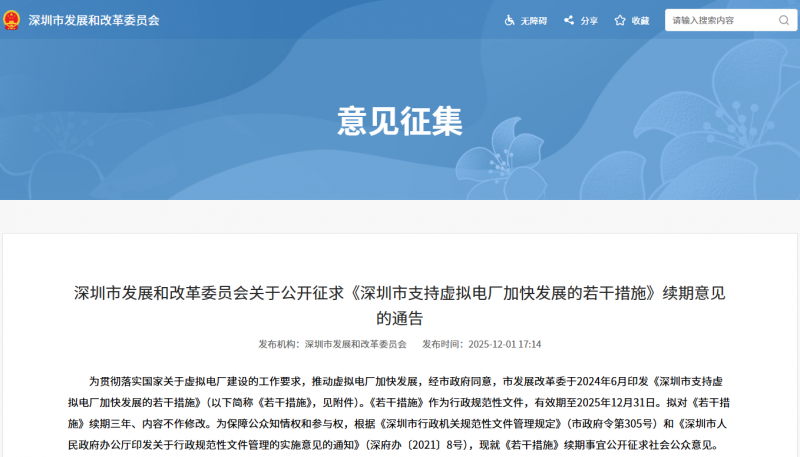 深圳市發(fā)展和改革委員會(huì)關(guān)于公開征求《深圳市支持虛擬電廠加快發(fā)展的若干措施》續(xù)期意見的通告