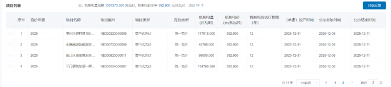 根據(jù)公示,2025年統(tǒng)一競(jìng)價(jià)項(xiàng)目競(jìng)價(jià)出清結(jié)果:機(jī)制電量規(guī)模13.572735億千瓦時(shí),機(jī)制電價(jià)水平0.3929元/kWh,項(xiàng)目14個(gè)。