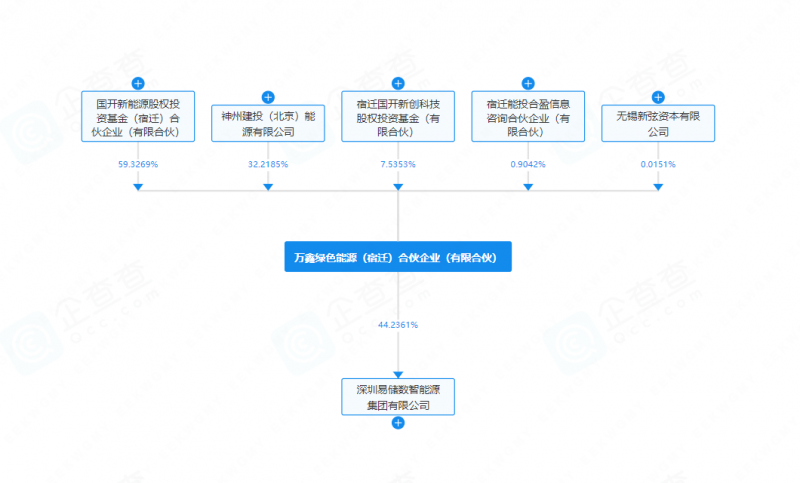 該公司于9月提交注冊(cè),從成立到接手深圳易儲(chǔ),尚不足20天。翻開(kāi)其股東名單,第一大股東為國(guó)開(kāi)新能源股權(quán)投資基金(宿遷)合伙企業(yè)(有限合伙),是錫創(chuàng)投管理的宿遷政府引導(dǎo)基金,出資額比例達(dá)到98.4741%。第二大股東為宿遷能投合盈信息咨詢(xún)合伙企業(yè)(有限合伙),出資額比例為1.5009%,其股東為9個(gè)自然人。第三大股東為無(wú)錫新弦資本有限公司,是國(guó)開(kāi)新能源股權(quán)投資基金(宿遷)合伙企業(yè)(有限合伙)的基金管理人無(wú)錫國(guó)聯(lián)新創(chuàng)私募投資基金有限公司旗下子公司,出資額比例為0.025%。