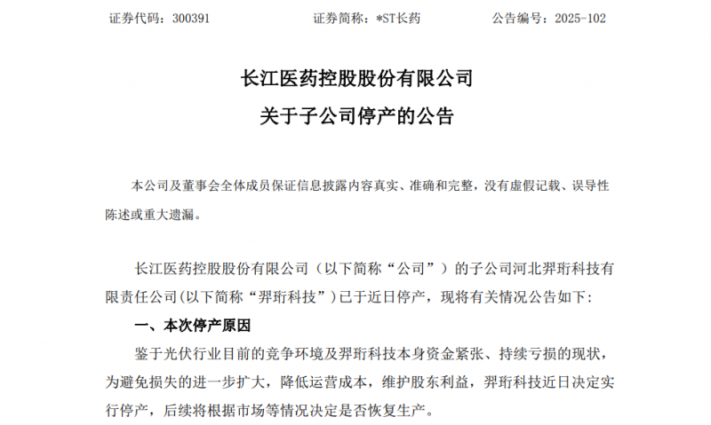 公告強(qiáng)調(diào),羿珩科技主要經(jīng)營(yíng)光伏產(chǎn)品,其停產(chǎn)不會(huì)對(duì)公司醫(yī)藥產(chǎn)業(yè)正常生產(chǎn)經(jīng)營(yíng)活動(dòng)產(chǎn)生不利影響。
