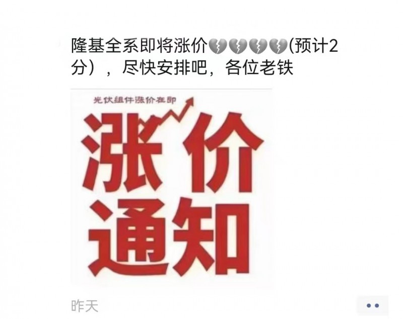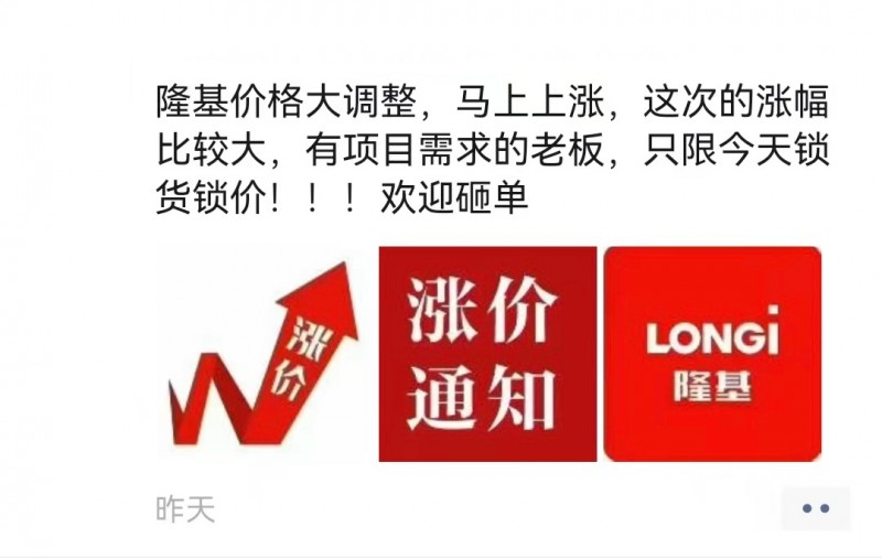 部分頭部廠商已釋放出漲價風聲,據(jù)最新消息,隆基價格將上調(diào),預(yù)計幅度從2分到4分不等。