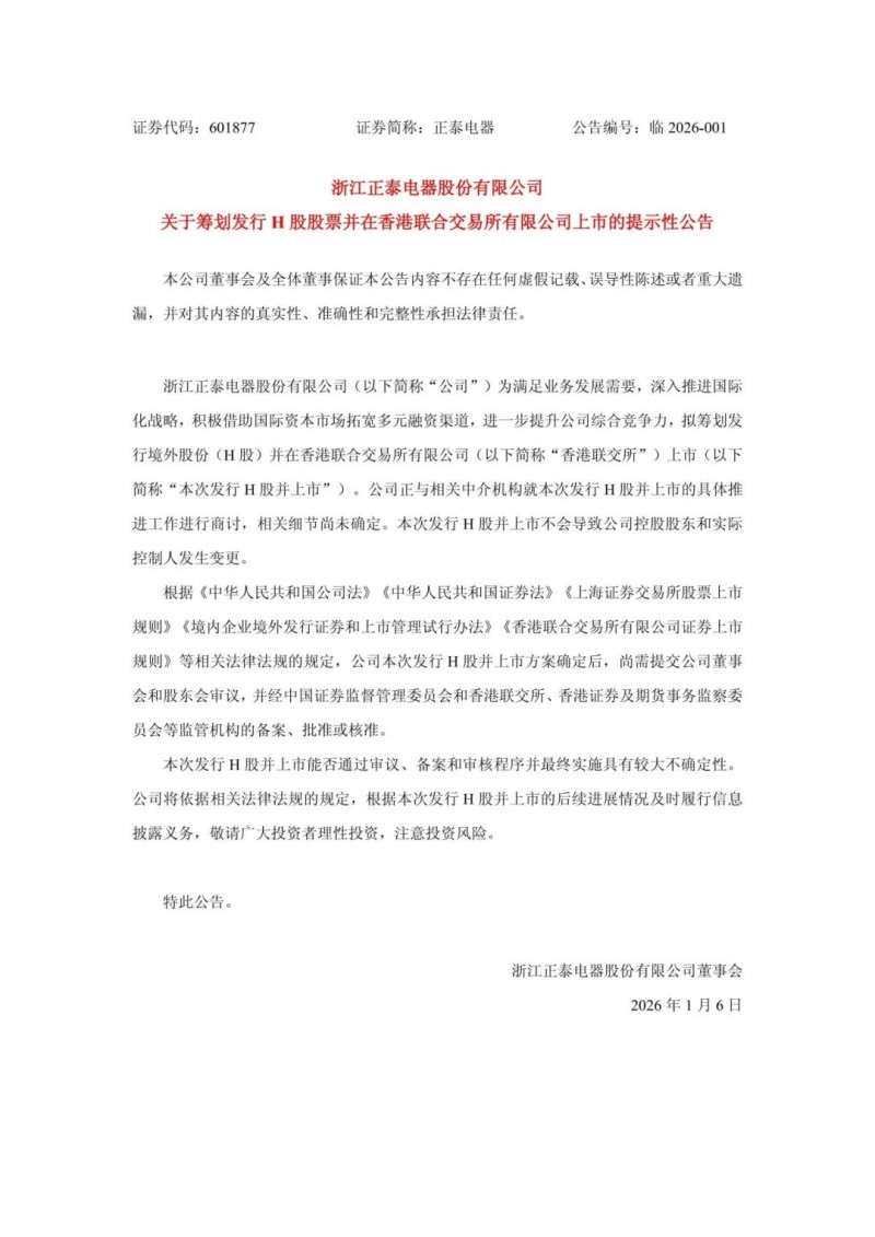 1月5日晚間,正泰電器發(fā)布公告稱,公司為滿足業(yè)務發(fā)展需要,深入推進國際化戰(zhàn)略,積極借助國際資本市場拓寬多元融資渠道,進一步提升公司綜合競爭力,擬籌劃發(fā)行境外股份(H股)并在香港聯(lián)合交易所有限公司(以下簡稱“香港聯(lián)交所”)上市。