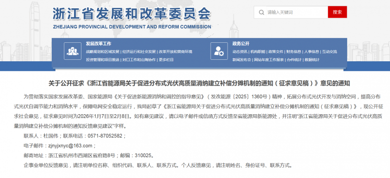 為貫徹落實(shí)國(guó)家發(fā)展改革委、國(guó)家能源局《關(guān)于促進(jìn)新能源消納和調(diào)控的指導(dǎo)意見》(發(fā)改能源〔2025〕1360號(hào))精神,拓展分布式光伏開發(fā)與消納空間,提高分布式光伏自調(diào)節(jié)能力和消納水平,保障電網(wǎng)安全穩(wěn)定運(yùn)行,我局起草了《浙江省能源局關(guān)于促進(jìn)分布式光伏高質(zhì)量消納建立補(bǔ)償分?jǐn)倷C(jī)制的通知(征求意見稿)》,現(xiàn)公開征求社會(huì)意見,征求意見時(shí)間為2026年1月7日至2月8日。如有意見建議,請(qǐng)以電子郵件或信函方式反饋至省能源局新能源處,并注明“浙江省能源局關(guān)于促進(jìn)分布式光伏高質(zhì)量消納建立補(bǔ)償分?jǐn)倷C(jī)制的通知反饋意見建議”字樣。