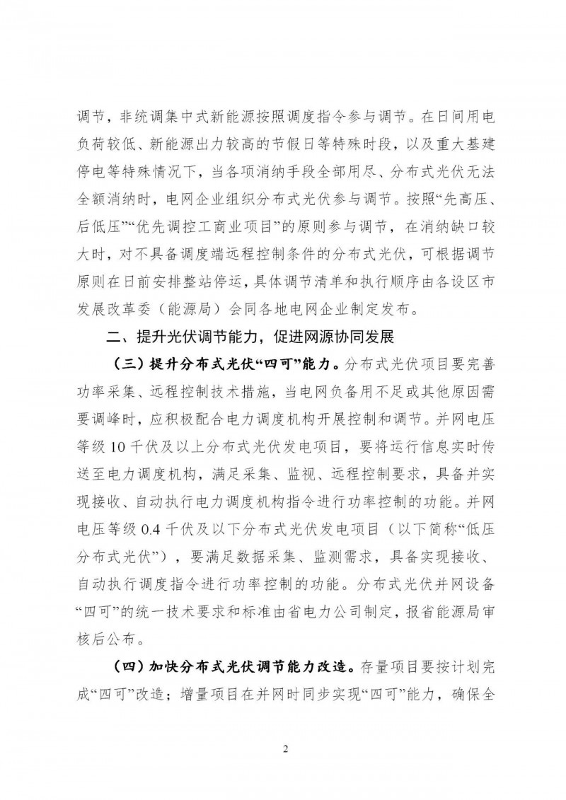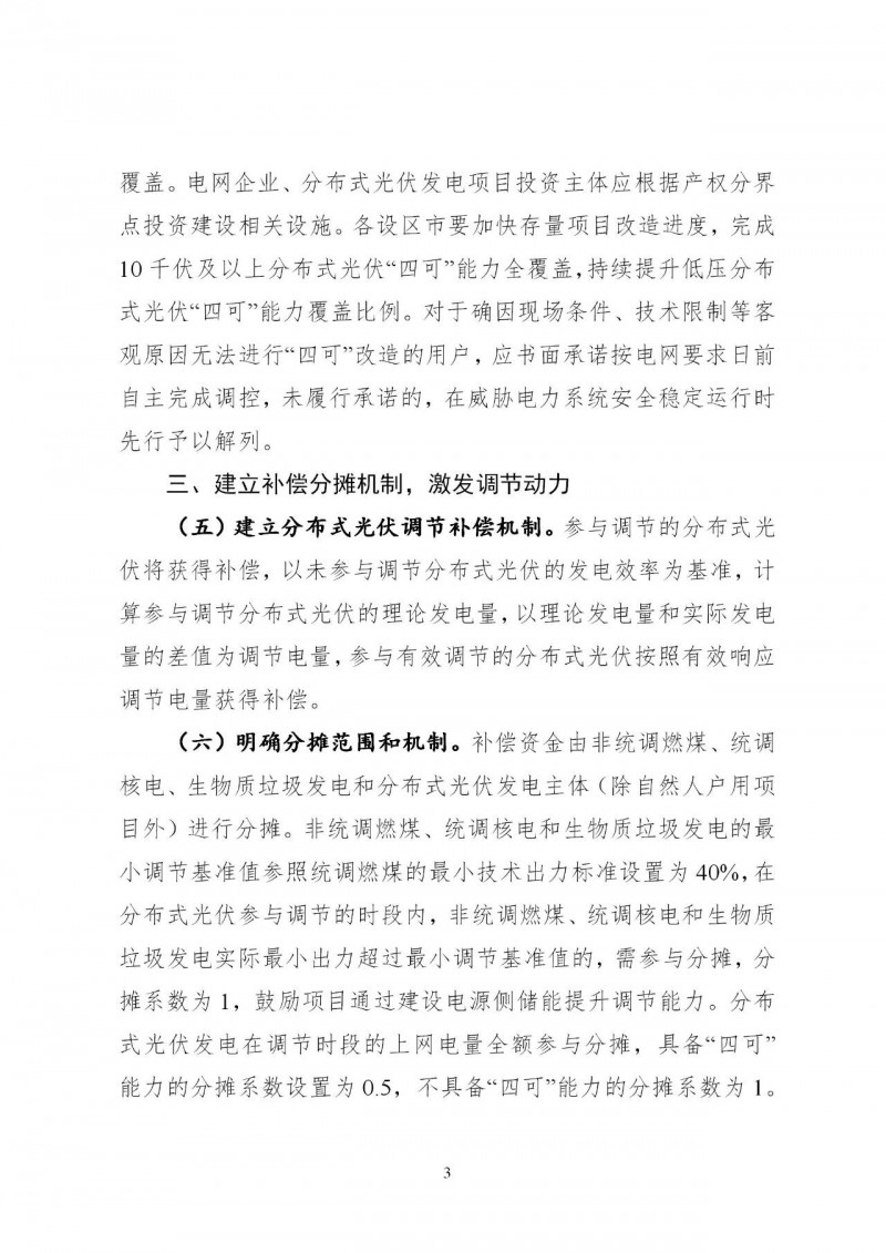 加快分布式光伏調(diào)節(jié)能力改造。存量項(xiàng)目要按計(jì)劃完成“四可”改造;增量項(xiàng)目在并網(wǎng)時(shí)同步實(shí)現(xiàn)“四可”能力,確保全覆蓋。電網(wǎng)企業(yè)、分布式光伏發(fā)電項(xiàng)目投資主體應(yīng)根據(jù)產(chǎn)權(quán)分界點(diǎn)投資建設(shè)相關(guān)設(shè)施。各設(shè)區(qū)市要加快存量項(xiàng)目改造進(jìn)度,完成10千伏及以上分布式光伏“四可”能力全覆蓋,持續(xù)提升低壓分布式光伏“四可”能力覆蓋比例。對(duì)于確因現(xiàn)場(chǎng)條件、技術(shù)限制等客觀原因無(wú)法進(jìn)行“四可”改造的用戶,應(yīng)書面承諾按電網(wǎng)要求日前自主完成調(diào)控,未履行承諾的,在威脅電力系統(tǒng)安全穩(wěn)定運(yùn)行時(shí)先行予以解列。