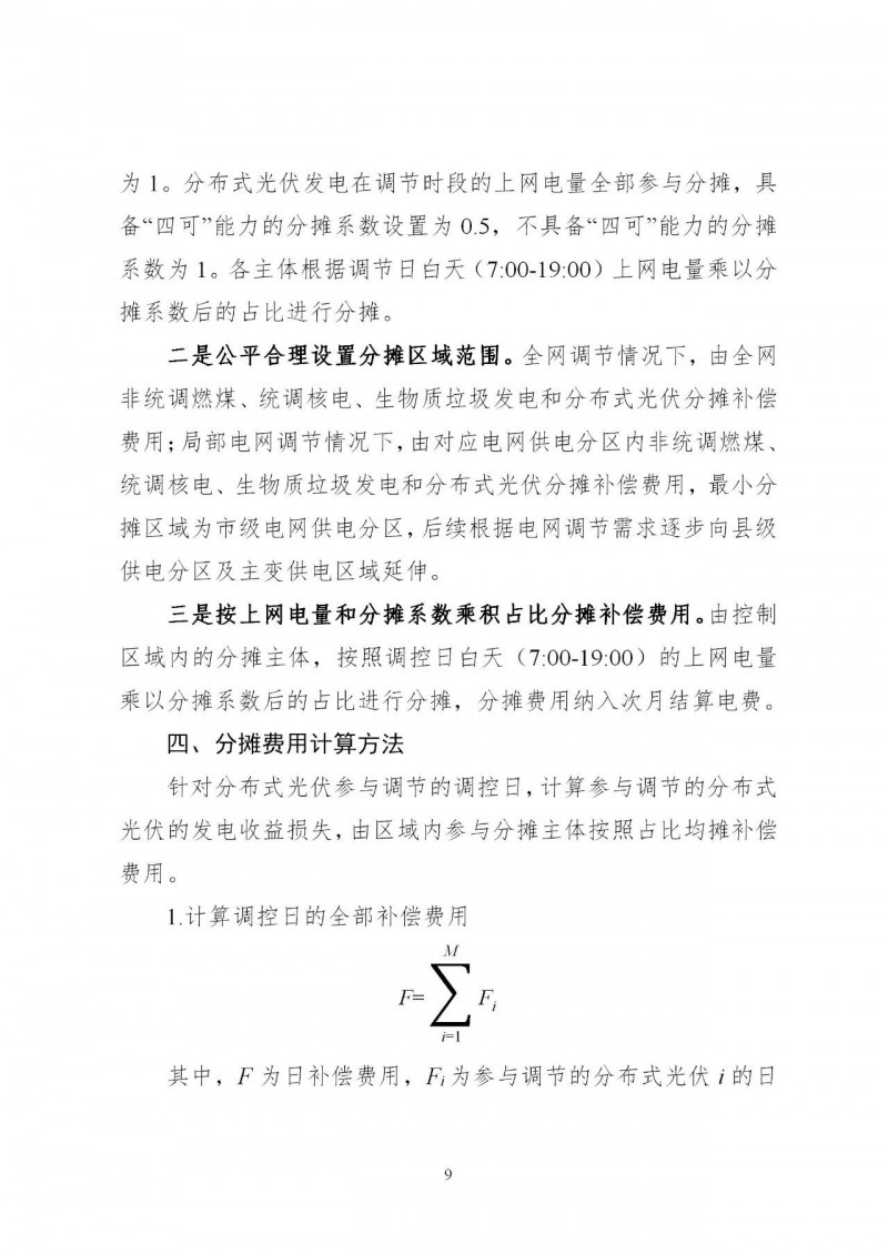 明確分?jǐn)偡秶蜋C(jī)制。補(bǔ)償資金由非統(tǒng)調(diào)燃煤、統(tǒng)調(diào)核電、生物質(zhì)垃圾發(fā)電和分布式光伏發(fā)電主體(除自然人戶用項(xiàng)目外)進(jìn)行分?jǐn)?。非統(tǒng)調(diào)燃煤、統(tǒng)調(diào)核電和生物質(zhì)垃圾發(fā)電的最小調(diào)節(jié)基準(zhǔn)值參照統(tǒng)調(diào)燃煤的最小技術(shù)出力標(biāo)準(zhǔn)設(shè)置為40%,在分布式光伏參與調(diào)節(jié)的時(shí)段內(nèi),非統(tǒng)調(diào)燃煤、統(tǒng)調(diào)核電和生物質(zhì)垃圾發(fā)電實(shí)際最小出力超過(guò)最小調(diào)節(jié)基準(zhǔn)值的,需參與分?jǐn)偅謹(jǐn)傁禂?shù)為1,鼓勵(lì)項(xiàng)目通過(guò)建設(shè)電源側(cè)儲(chǔ)能提升調(diào)節(jié)能力。分布式光伏發(fā)電在調(diào)節(jié)時(shí)段的上網(wǎng)電量全額參與分?jǐn)?,具?ldquo;四可”能力的分?jǐn)傁禂?shù)設(shè)置為0.5,不具備“四可”能力的分?jǐn)傁禂?shù)為1。各主體根據(jù)調(diào)節(jié)日白天(7:00-19:00)上網(wǎng)電量乘以分?jǐn)傁禂?shù)后的占比進(jìn)行分?jǐn)?。按照全網(wǎng)調(diào)節(jié)和局部電網(wǎng)調(diào)節(jié)情況,公平合理分?jǐn)傎M(fèi)用。