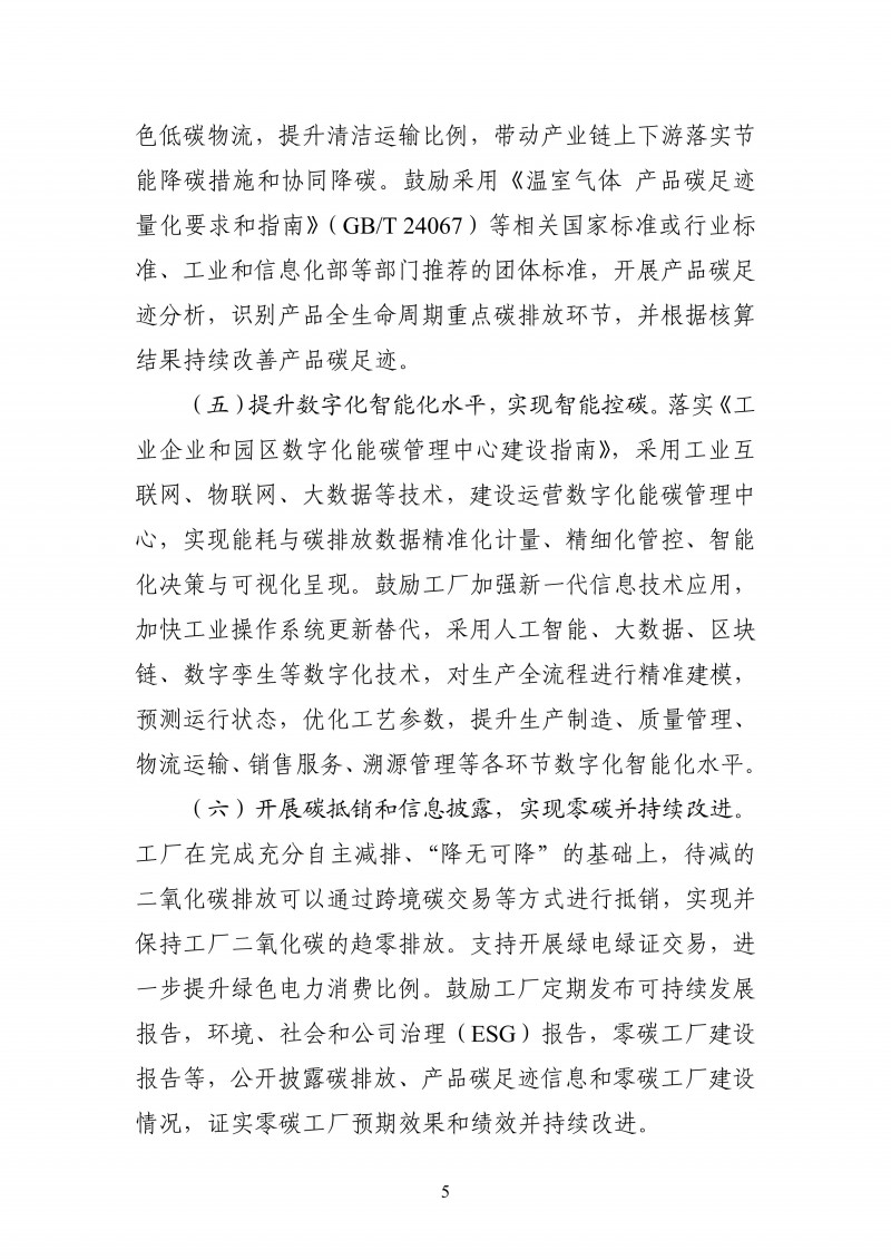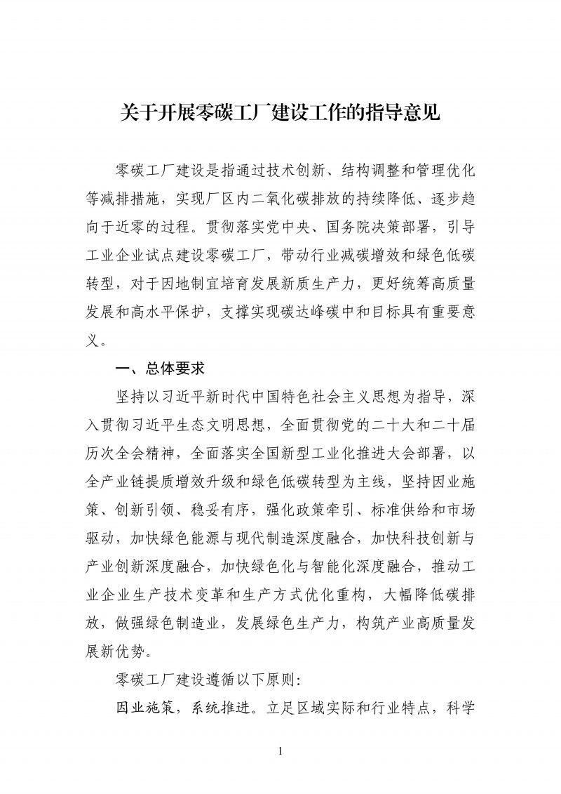 為堅持以習近平新時代中國特色社會主義思想為指導,深入貫徹習近平生態(tài)文明思想,全面貫徹黨的二十大和二十屆歷次全會精神,落實國務院辦公廳《制造業(yè)綠色低碳發(fā)展行動方案(2025—2027年)》,深挖工業(yè)和信息化領域節(jié)能降碳潛力,帶動重點行業(yè)領域減碳增效和綠色低碳轉(zhuǎn)型,培育發(fā)展新質(zhì)生產(chǎn)力,工業(yè)和信息化部、國家發(fā)展改革委、生態(tài)環(huán)境部、國務院國資委、國家能源局共同研究制定了《關于開展零碳工廠建設工作的指導意見》?,F(xiàn)印發(fā)給你們,請結(jié)合實際,認真貫徹落實。