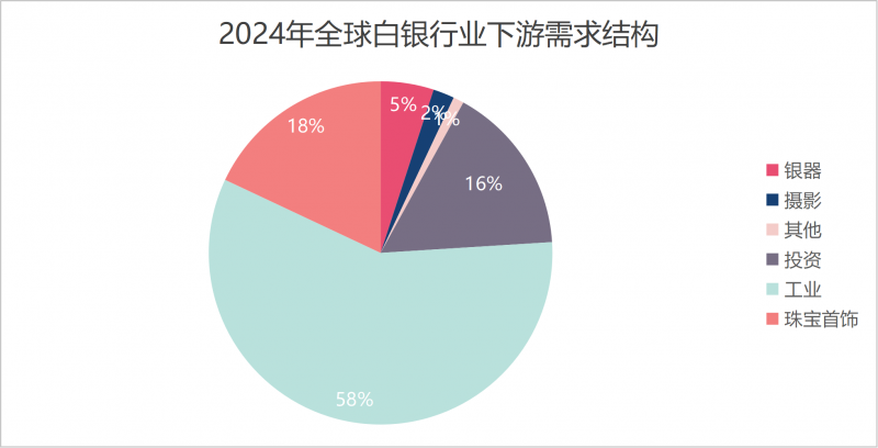 據(jù)世界白銀協(xié)會(huì)數(shù)據(jù),2024年白銀需求中,工業(yè)、珠寶首飾、投資分別占58%、18%、16%,而工業(yè)需求中,電氣領(lǐng)域占23%,光伏領(lǐng)域占17%。
