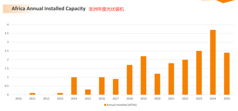 非洲太陽能產(chǎn)業(yè)協(xié)會(huì)(AFSIA)稱,到2025年,非洲新增太陽能裝機(jī)容量2.4GW,總裝機(jī)容量達(dá)到23.4GW。協(xié)會(huì)首席執(zhí)行官John van Zuylen稱這一成就“非常積極”。