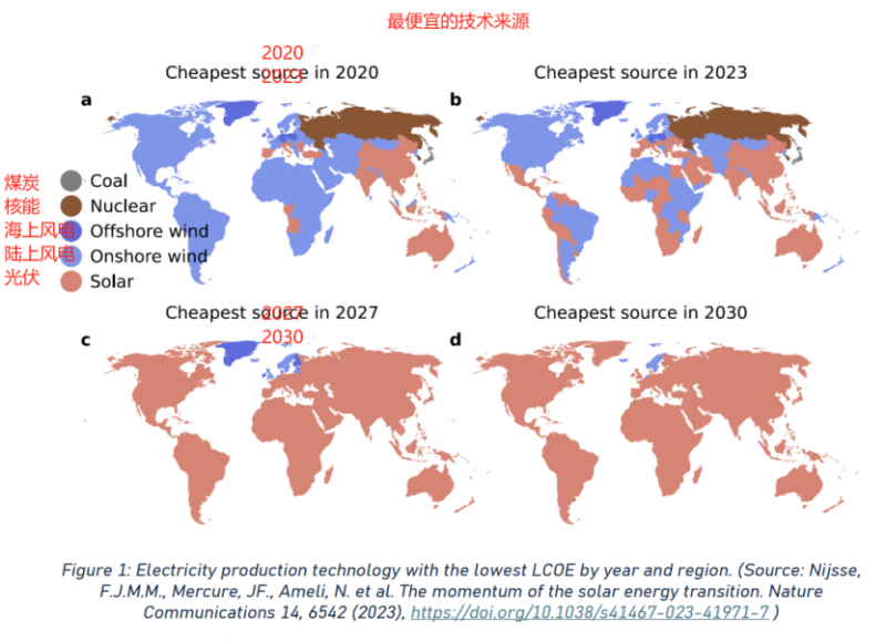 這一增長得益于太陽能成本的快速下降和部署范圍的擴大。如圖所示,2020年到2023年,發(fā)生了重大轉變。預計2023年至2027年間,光伏將成為成本最低的電力來源。到2030年,光伏預計將成為全球大多數(shù)地區(qū)平準化電力成本(LCOE)最低的發(fā)電方式。