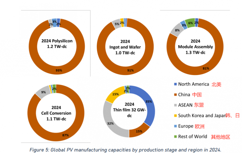 此外,該研究還揭示了一種結構性失衡:中國在整個硅基光伏價值鏈的制造環(huán)節(jié)中占據(jù)主導地位,產(chǎn)能占比超過80%。而歐洲雖然保有技術領先,但缺乏有效競爭所需的產(chǎn)業(yè)規(guī)模及本土市場。