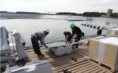 電池板設(shè)置作業(yè),先要在陸地上將電池板安裝在浮體式架臺上,將連接14張電池板的陣列(電池板設(shè)置單位),用船拖至水上的電池板設(shè)置場所(水上漂浮的太陽能電池板)后,再行連接。