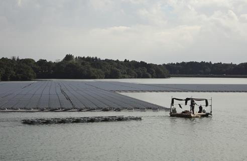 在湖畔的作業(yè)場將太陽能電池板裝在浮體架臺上