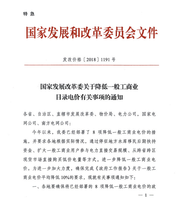 2018年3月28日,發(fā)改委發(fā)布了特急《關(guān)于降低一般工商業(yè)電價有關(guān)事項(xiàng)的通知》,分兩批實(shí)施降價措施,第一批降價措施全部用于降低一般工商業(yè)電價,自2018年4月1日起執(zhí)行。