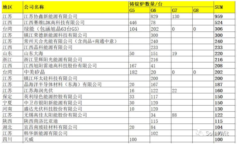 這張表只展現(xiàn)了多晶爐數(shù)量大于100臺的企業(yè),在我的整個數(shù)據(jù)庫中多晶鑄錠企業(yè)多達105家,合計7657臺多晶爐,這些爐子如果都滿產(chǎn)每個月至少可生產(chǎn)30億+張硅片,而目前全行業(yè)多晶硅片月產(chǎn)出只有8億片/月。多晶硅片的全行業(yè)開工率不足三成。
