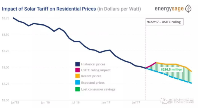 2017年9月后的全美范圍內(nèi)的光伏產(chǎn)品價格上漲,關稅實際上給美國消費者帶來了2.365億美元的稅收。