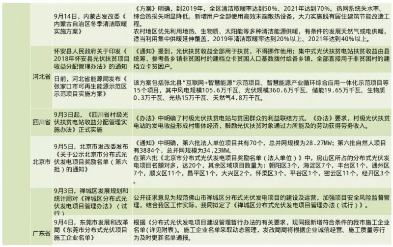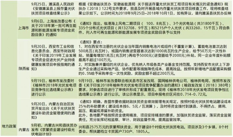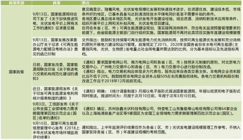 國(guó)家:出臺(tái)光伏新政策6條;政策內(nèi)容要點(diǎn)諸如:各地區(qū)組織開(kāi)展平價(jià)上網(wǎng)和無(wú)補(bǔ)貼風(fēng)電、光伏發(fā)電項(xiàng)目建設(shè);