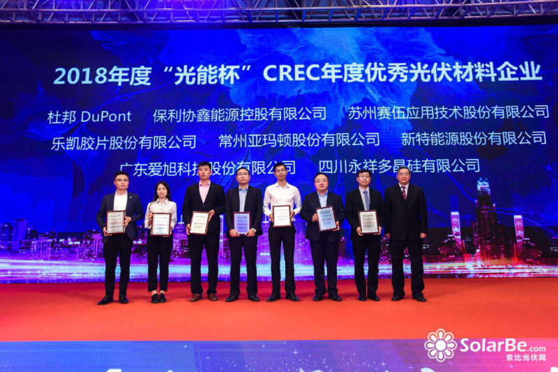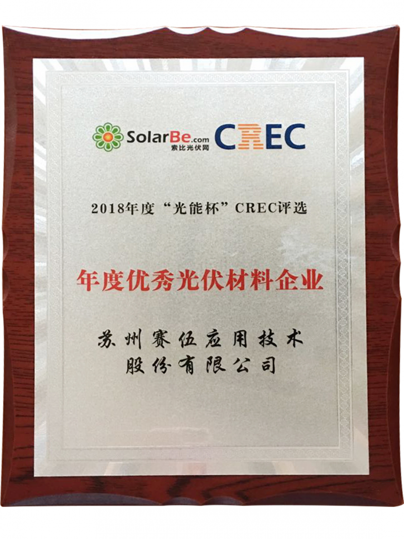 2018年度“光能杯“評選活動主旨以十年來國內(nèi)光伏行業(yè)發(fā)展技術(shù)、市場、產(chǎn)品、工藝等為背景細(xì)數(shù)光伏行業(yè)最佳技術(shù)成就、最佳企業(yè)展示、最佳團(tuán)隊(duì)、行業(yè)十佳企業(yè)領(lǐng)袖等。本次活動也吸引了中國光伏領(lǐng)域上百家重量級企業(yè)的積極參與。作為全球領(lǐng)先綜合高分子材料方案解決商,蘇州賽伍應(yīng)邀出席本屆盛會并豪攬“2018年度光能杯CREC年度領(lǐng)航者企業(yè)大獎”和 ”2018年度光能杯CREC年度優(yōu)秀光伏材料企業(yè)”雙料大獎。