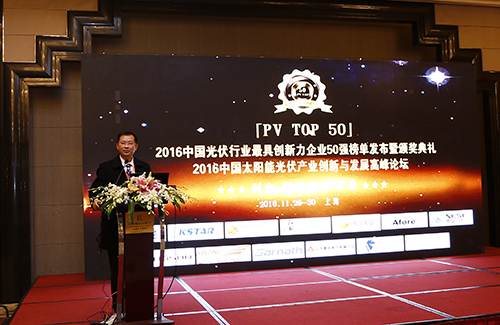 由光伏產(chǎn)業(yè)網(wǎng)主辦、中國智能光伏產(chǎn)業(yè)聯(lián)盟協(xié)辦的「PV TOP 50」2016中國光伏行業(yè)最具創(chuàng)新力企業(yè)50強榜單發(fā)布暨頒獎典禮于2016年11月29日在上海淳大萬麗酒店隆重舉行,2016中國太陽能光伏產(chǎn)業(yè)創(chuàng)新與發(fā)展高峰論壇同期召開。