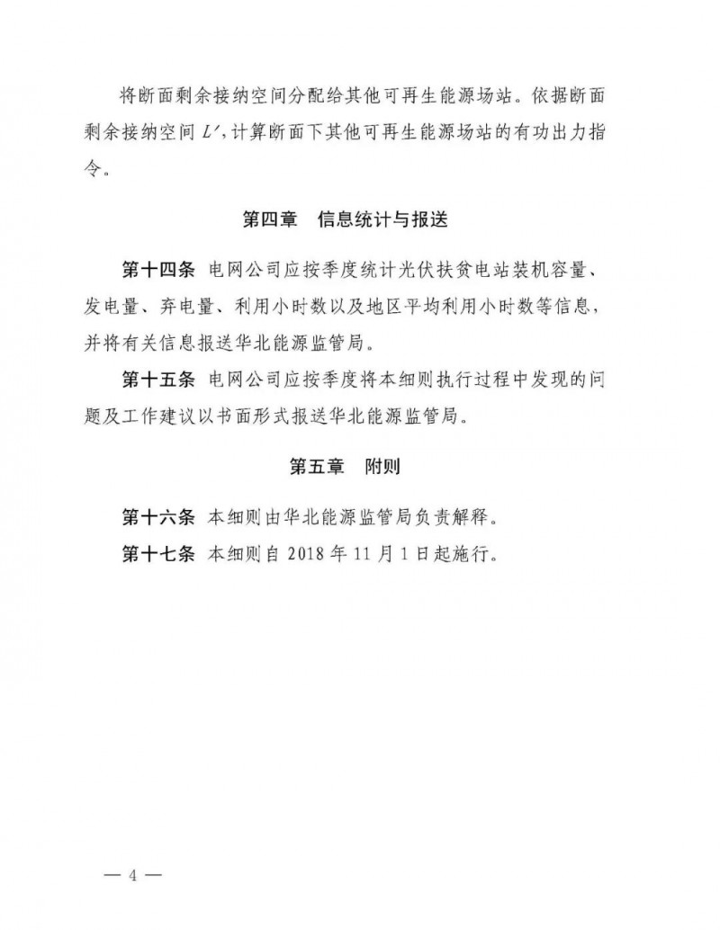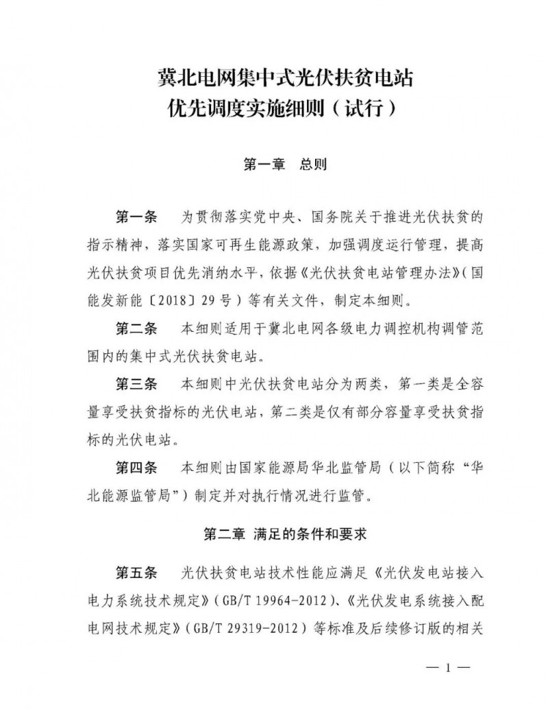 文件要求:華北電網(wǎng)有限公司,國網(wǎng)冀北電力有限公司,為貫徹黨中央、國務院關于打好扶貧攻堅戰(zhàn)的重要指示,積極落實光伏扶貧有關政策,進一步提高可再生能源消納水平,確保光伏扶貧項目電量優(yōu)先消納,國家能源局華北能源監(jiān)管局組織制定了《冀北電網(wǎng)集中式光伏扶貧電站優(yōu)先調度實施細則(試行)》。經(jīng)向有關電力企業(yè)征求意見,現(xiàn)予印發(fā),請相關單位于2018年11月1日起執(zhí)行。 執(zhí)行中如遇重大問題,請及時報告我局。